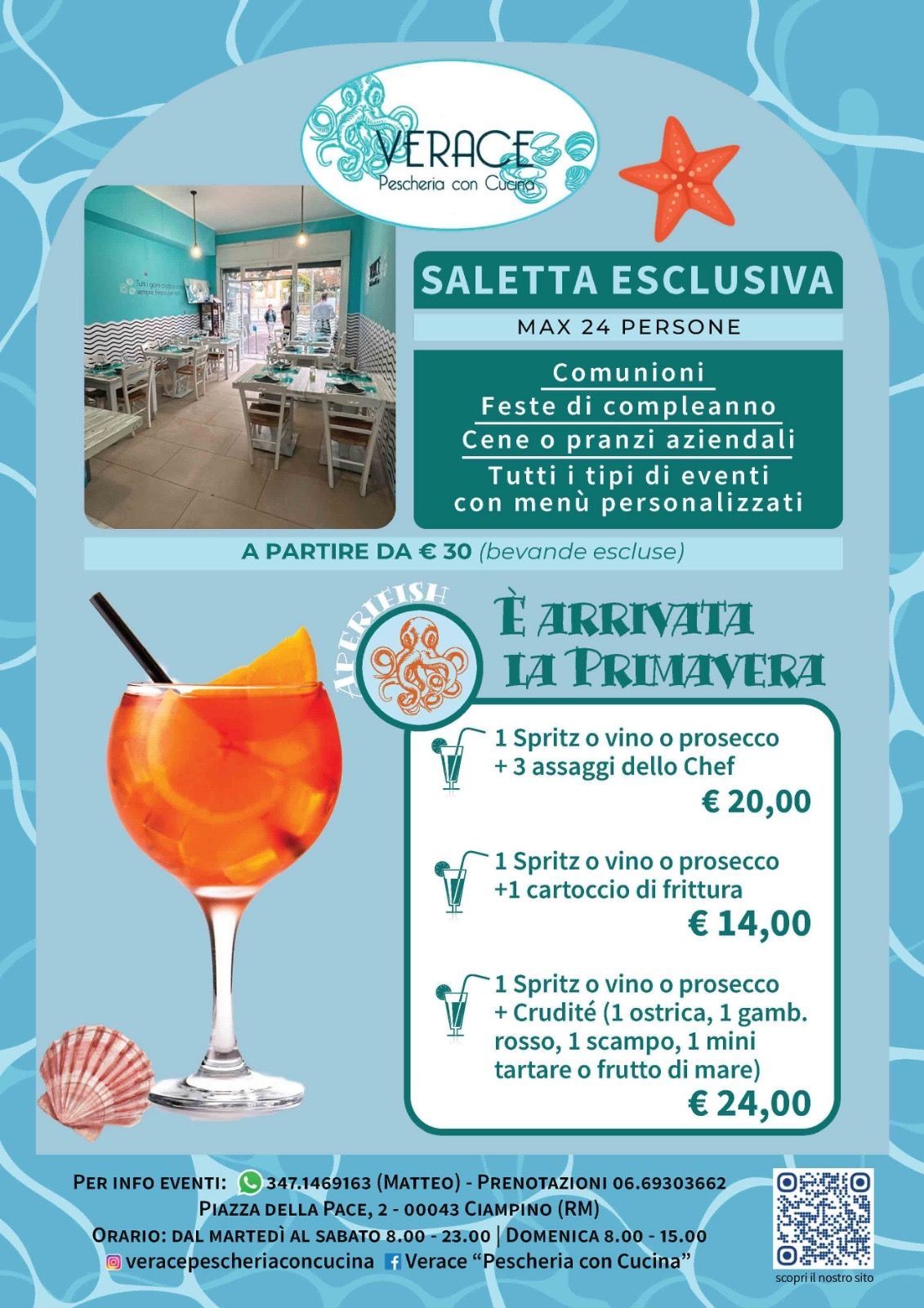 Scopri Verace – Pescheria con Cucina, la tua ristopescheria di fiducia nel cuore di Ciampino, a pochi minuti da Roma Sud e dai Castelli Romani. Siamo il punto di riferimento per gli amanti del pesce freschissimo e della cucina di mare autentica, dove ogni giorno si incontrano la tradizione marinara e l'eccellenza culinaria. Da noi, il mare arriva direttamente sulla tua tavola, con una selezione di pescato che varia in base all'asta e una gastronomia che esalta i sapori più genuini. Offriamo un'esperienza completa: dalla scelta del pesce al banco alle specialità take away, fino a un menù espresso da gustare comodamente nella nostra sala interna o nella veranda coperta.
